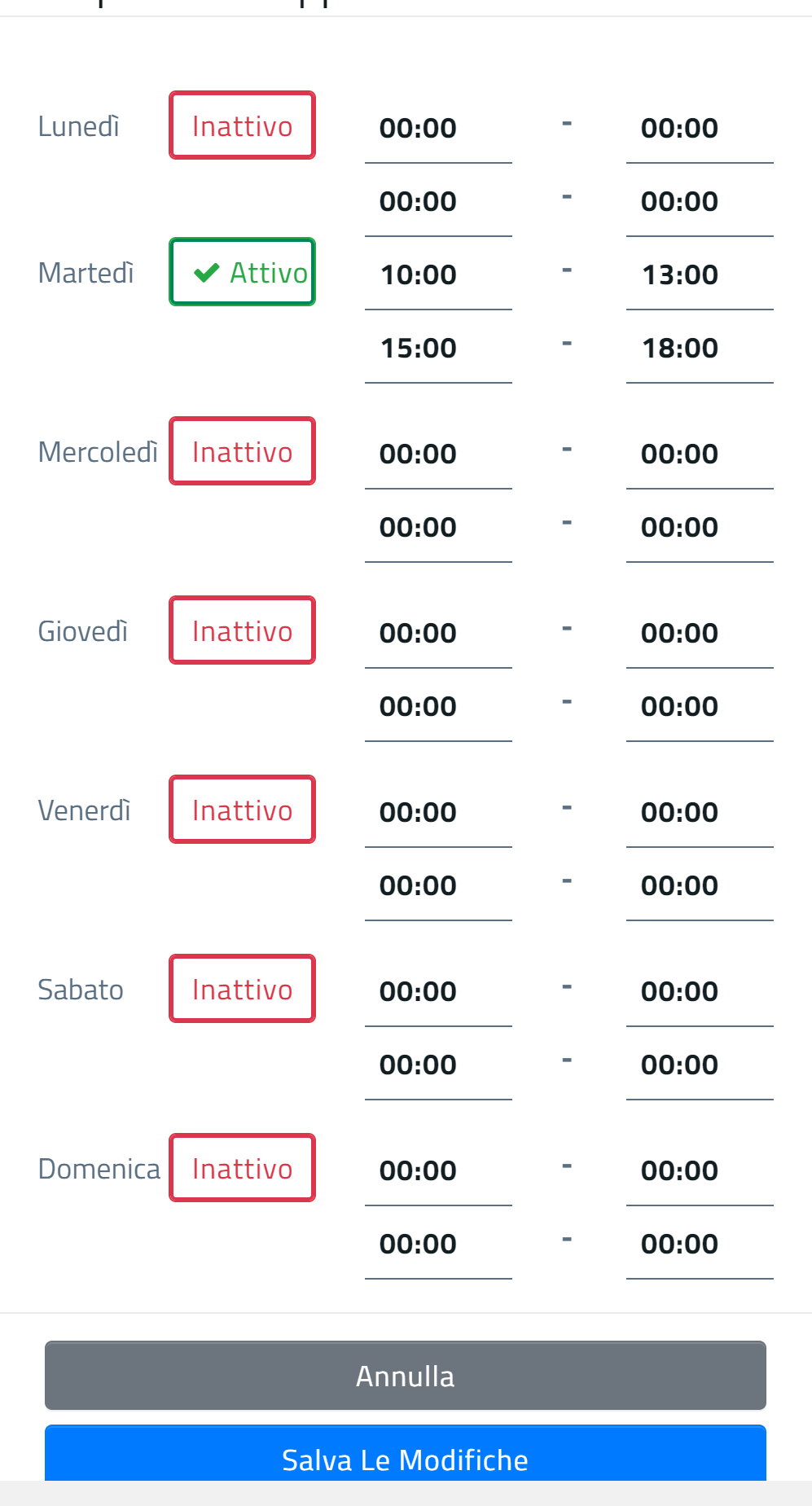 Per ogni giorno deve essere definita la fascia orario del mattino e del pomeriggio nella quale si effettuano gli appuntamenti.