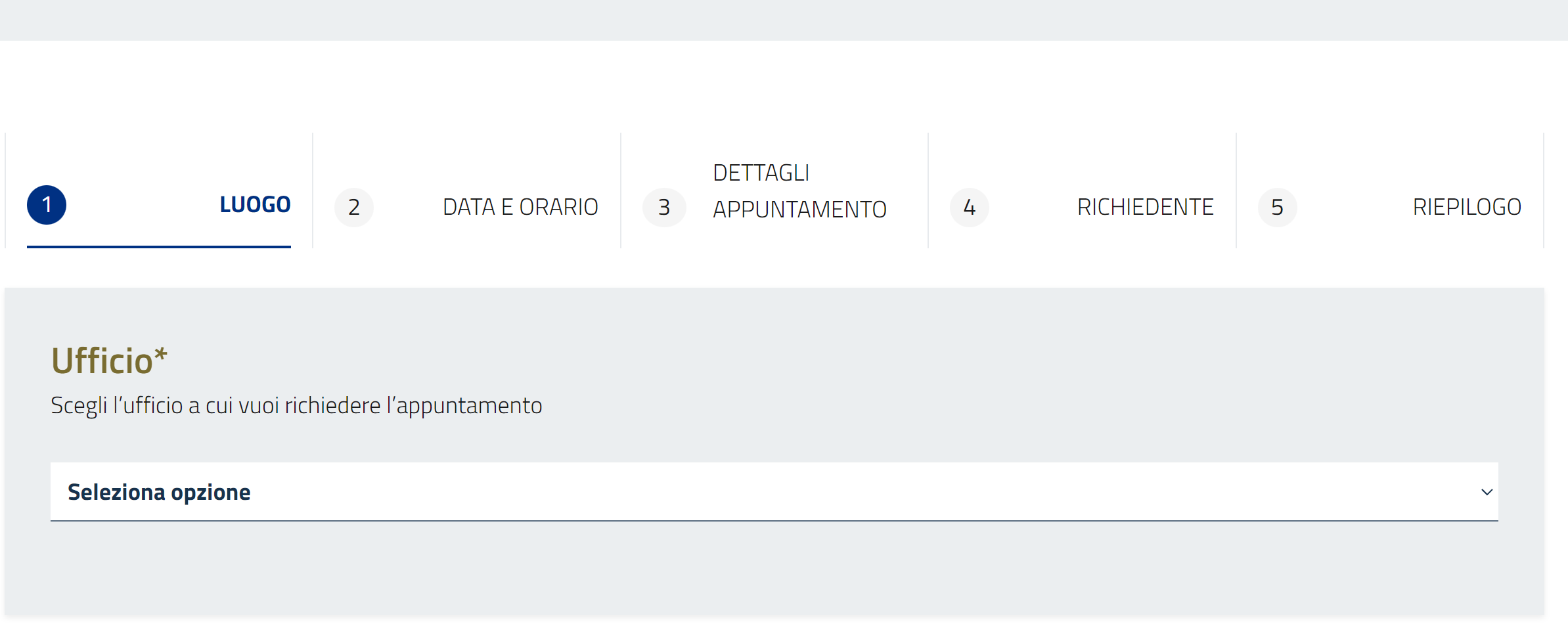 Il sistema guida il cittadino nella prenotazione attraverso 5 sezioni, partendo dal luogo, ovvero l'Ufficio/sede esterna dove è ubicato il servizio per il quale il cittadino intende prenotare un appuntamento.